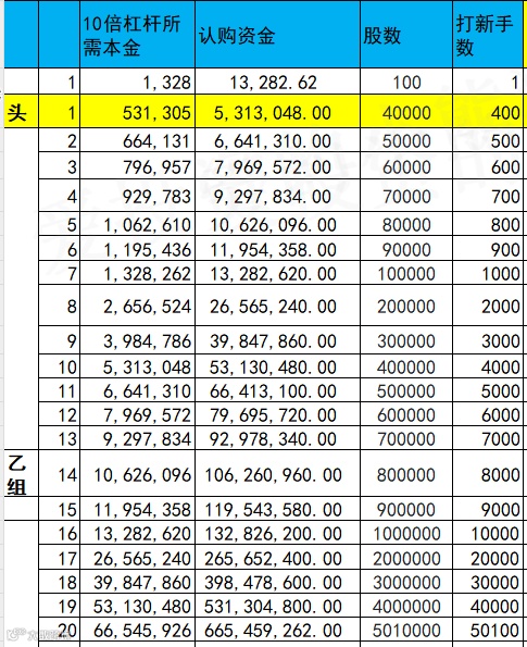 甲组的各档融资所需要的本金还有融资金额对应如下表: