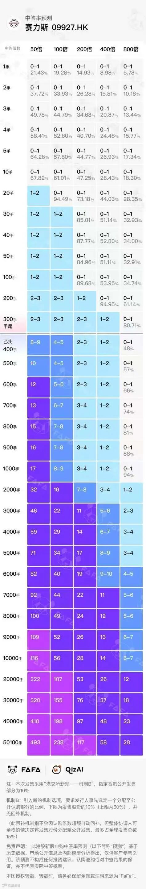 赛力斯本次IPO采用港交所「机制B」模式,公开发售与国际配售比例固定为1:9,无回拨机制。关于一手中签率方面,无论孖展多少倍,公配都是10%,按照20万人来参与预估一下,一手中签率15%!这个是大盘股,中签率会高很多。