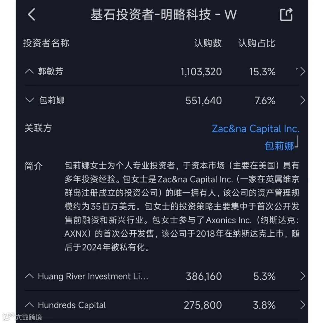 包莉娜个人作为基石还披露了他全资100%控股的bvi投资公司,这bvi公司有3,500万美金在投资。