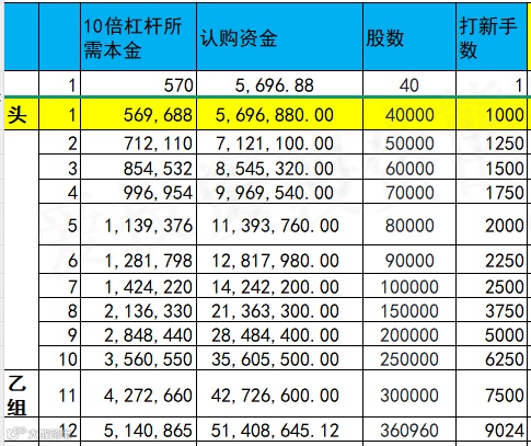 甲组的各档融资所需要的本金还有融资金额对应如下表: