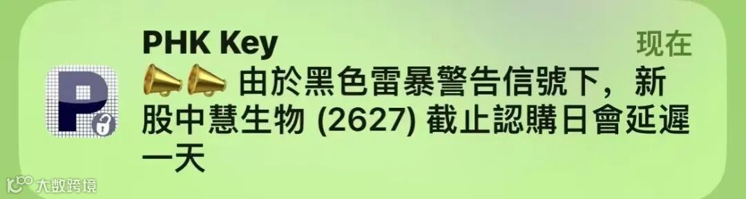 辉立也通知了,由於黑色雷暴警告信號下,新股中慧生物 (2627) 截止認購日會延遲一天。輝立截止日改為明天(8月6日)9:45.a.m,新股中慧生物 (2627.HK),如果今日11:15a.m.交易所還未發出最新的官方通告,我們將提交所有訂單。其後不接受任何更改,多謝配合!若交易所公佈新股延遲時間表,會與大家更新。