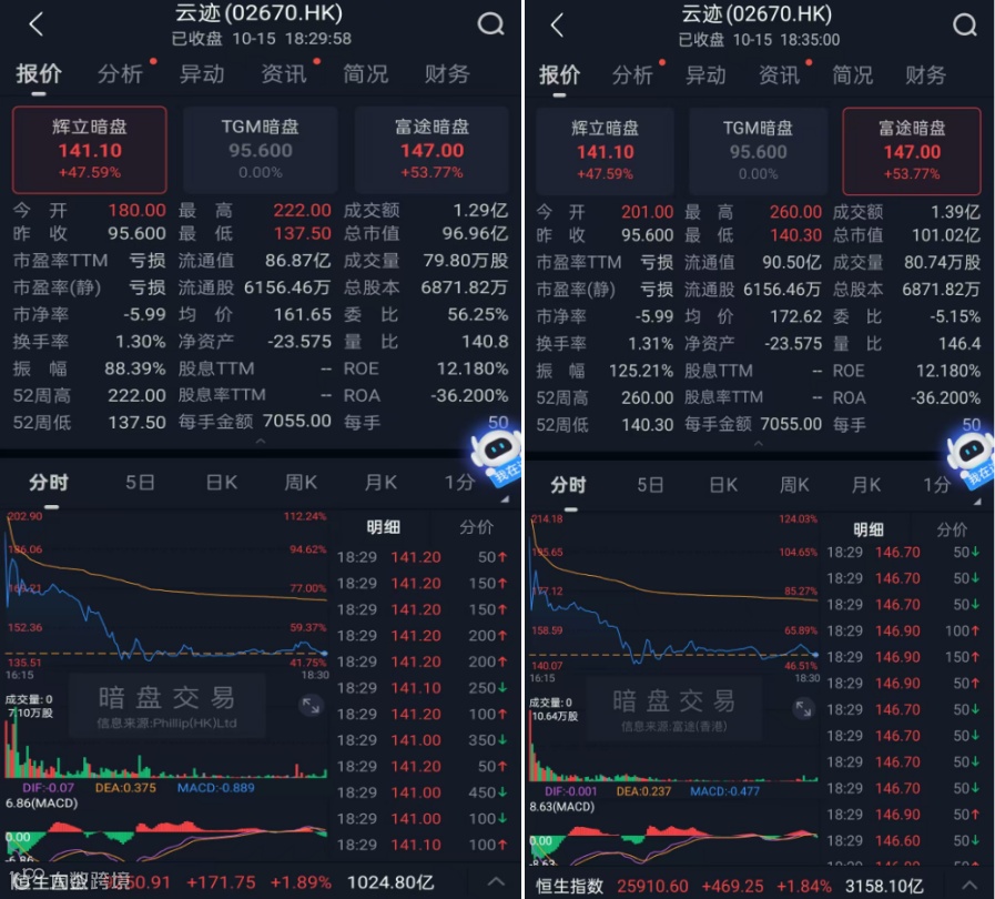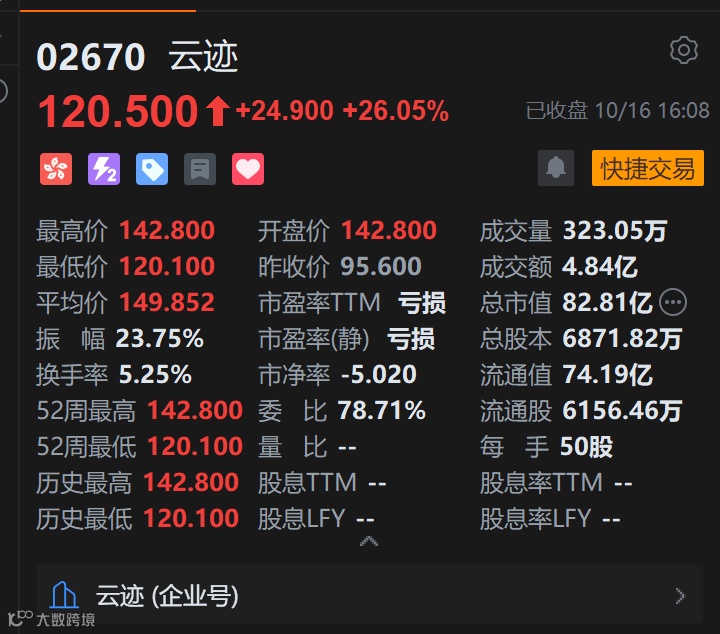 云迹科技以142.8港元/股开盘,较95.6港元的发行价大幅上涨49.37%,最高触及142.8港元,最低下探120.1港元,显示出市场情绪的剧烈博弈。最终收报120.5港元,涨幅收窄至26.05%,全日成交323.04万股,成交额4.84亿港元,总市值约为83亿港元 。