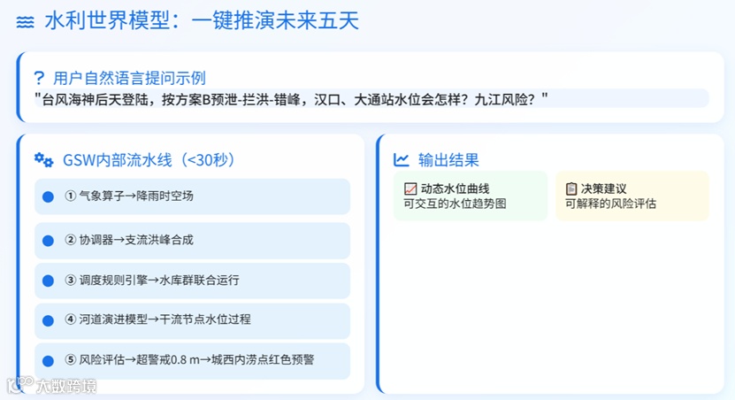 当这个“水利世界模型”构建完成后,它将不再是一个被动的查询系统,而是一个主动的推理和推演引擎。用户(如防汛指挥官、水资源调度员)可以用自然语言与之进行高度复杂的交互。