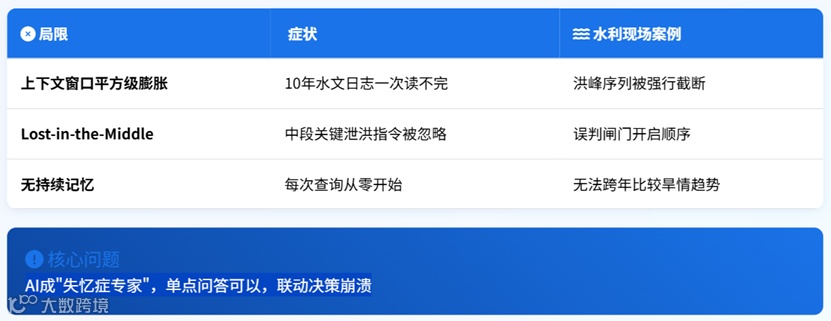 信息截断:当需要分析的资料(如一份完整的项目环境评估报告、一部长篇小说、一个水文站数十年的监测日志)超过模型的最大上下文窗口时,模型无法一次性“看到”全部内容。任何试图将长文本分块送入模型的方法,都不可避免地会割裂信息,丢失跨越块边界的全局关联。