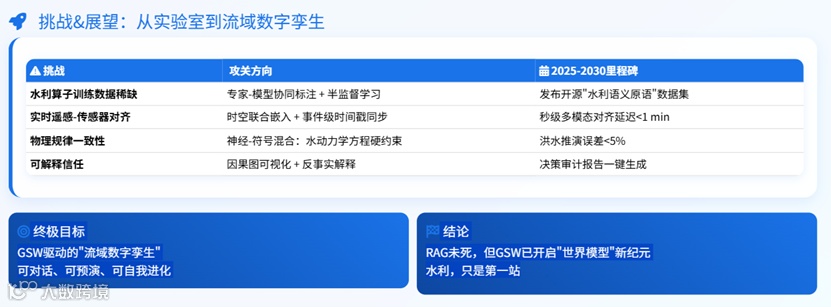 5.模型的可解释性与可信度:对于水利这种高风险决策领域,模型的“黑箱”特性是不可接受的。尽管GSW通过其结构化的内部模型提供了一定程度的可解释性,但如何让决策者完全信任其推理过程和结果,仍需大量的研究和验证工作。