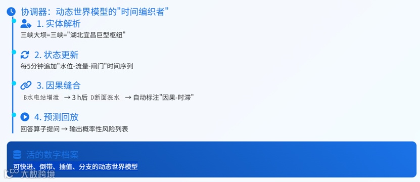 水利协调器是这个“世界模型”的大脑中枢。它执行着前文所述的实体解析、状态更新、信息整合和回答预测等功能,但在水利领域的应用将更加具体和强大。