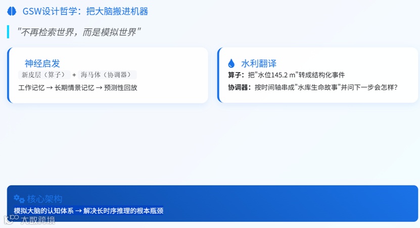 在此基础上,我们将着重展望并详细构想如何将GSW框架应用于水利领域,构建一个能够整合实时物联感知数据、历史文献、气象预报等多源信息的“水利世界模型”。