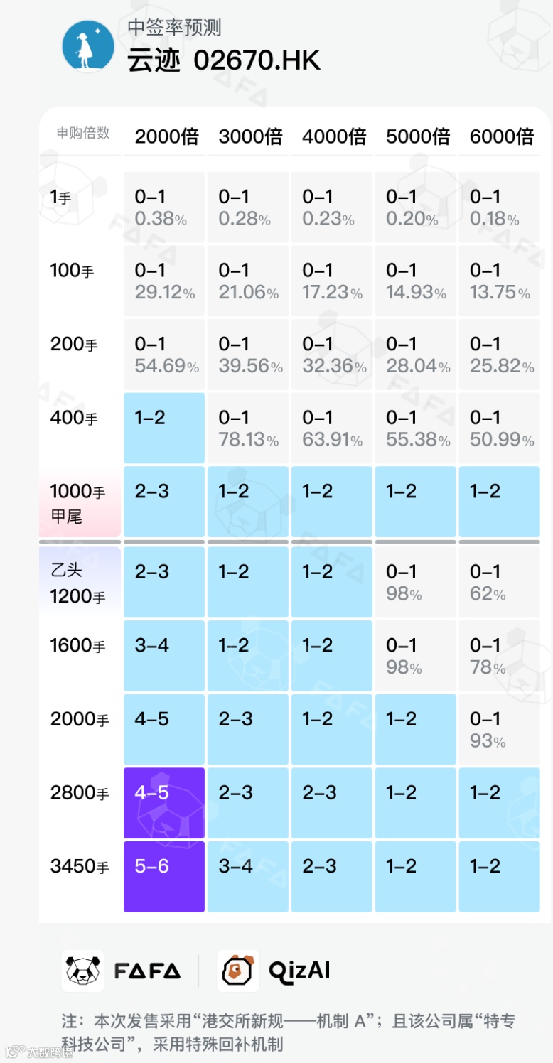 关于一手中签率方面,云迹本次公开发售按机制A, 由于孖展超过50倍,回拨20.00%,按照20万人来参与预估一下,一手中签率最好的情况也不超过3%,
