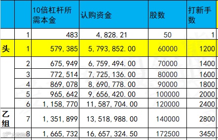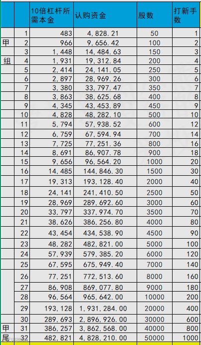 甲组的各档融资所需要的本金还有融资金额对应如下表: