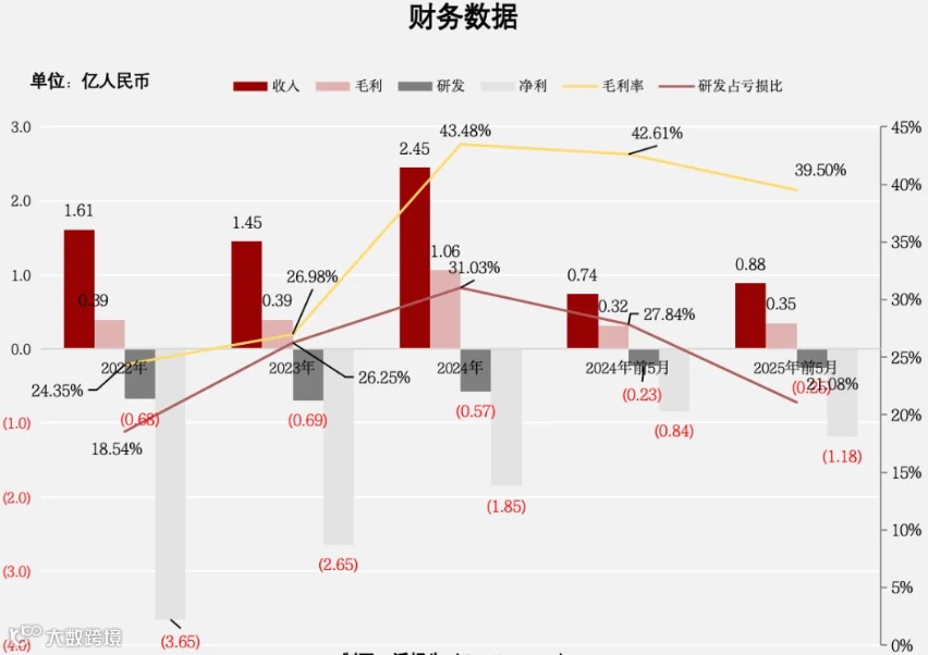 截至2025年5月31日,公司经营活动现金流为人民币-0.53亿元,账上现金0.75亿元。