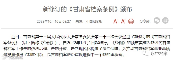 近日,甘肃省第十三届人民代表大会常务委员会第三十三次会议通过了新修订的《甘肃省档案条例》(以下简称《条例》),自2022年12月1日起施行。本次《条例》修订在档案开放利用方面迈出重大步伐,新增“监督检查”及档案信息化建设”专章,强调通过信息共享、联合执法、案件移送等方式,加强档案监督检查,要求全省各级人民政府将档案信息化纳入信息化发展规划和数字政府建设规划,推动档案信息化与各项信息化工作协调发展。