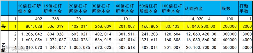 乙组头,这次是805万本金,乙组的各档融资所需要的本金还有融资金额对应如下表: