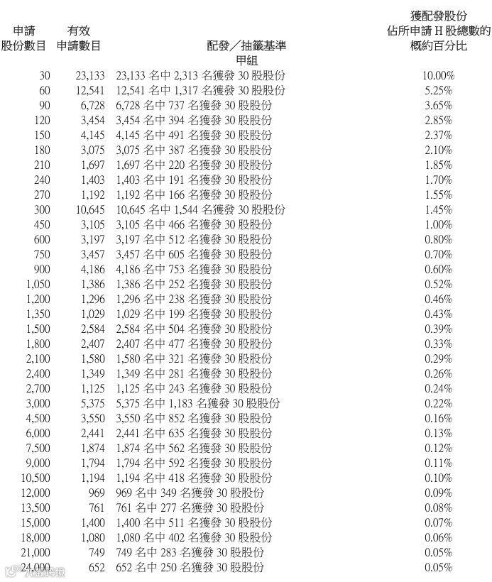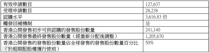 沪上阿姨 (02589.HK) 招股最终定价113.12港元,在招股价95.57港元-113.12港元的上限价,2.73亿港元的募资,118.60亿港元的总市值,H股市值66.81亿港元,发行比例2.30%。配售情况:127637人认购,这次公配3616.83倍,由于超过100倍,回拨比率50.00%,国配有2.57倍,一手中签率10.00%,认购1500手才必中2手,同时乙组8143人申购,其中顶头槌申购1631张,只获配3、4手,获配率0.08%-0.13%。