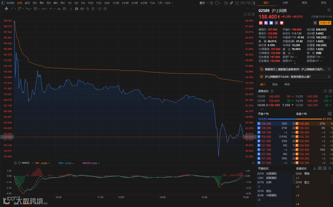 然后我们看看暗盘的情况,沪上阿姨(02589.HK) 辉立暗盘以最低点140.00港元高开,立马上冲最高点188.00港元,就回落到160.00港元后企稳,再震荡上行,尾盘以183.30港元报收,涨幅62.04%,振幅42.43%。