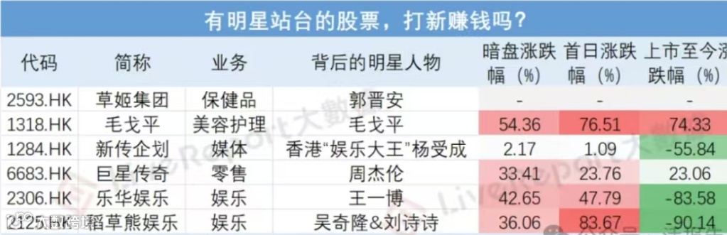 从之前港股新股的历史上来看,有明星站台的股票,从暗盘及首日涨跌幅数据来看,表现都较好,所以这个票至少开盘不会太差吧