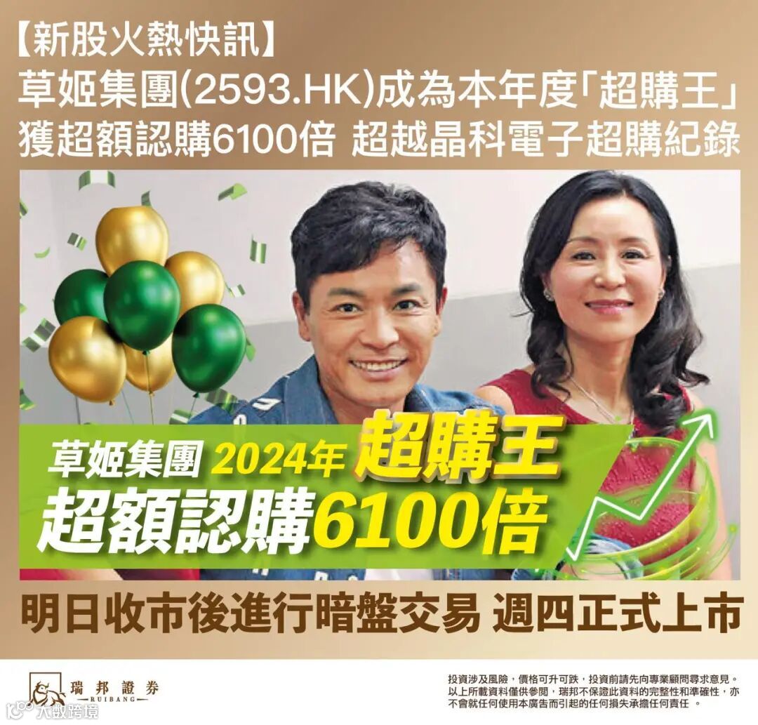 「郭晋安概念股」草姬集团不及2018年上市的毛记葵涌,新股史上超购倍数排第二,据市场消息指,该股公开发售部份录得超额认购约6100倍,为今年新股「超购王」,亦为港股历史上第二名超购倍数最多新股,低于第一名当时超购6288倍的 毛記葵涌 (01716)!