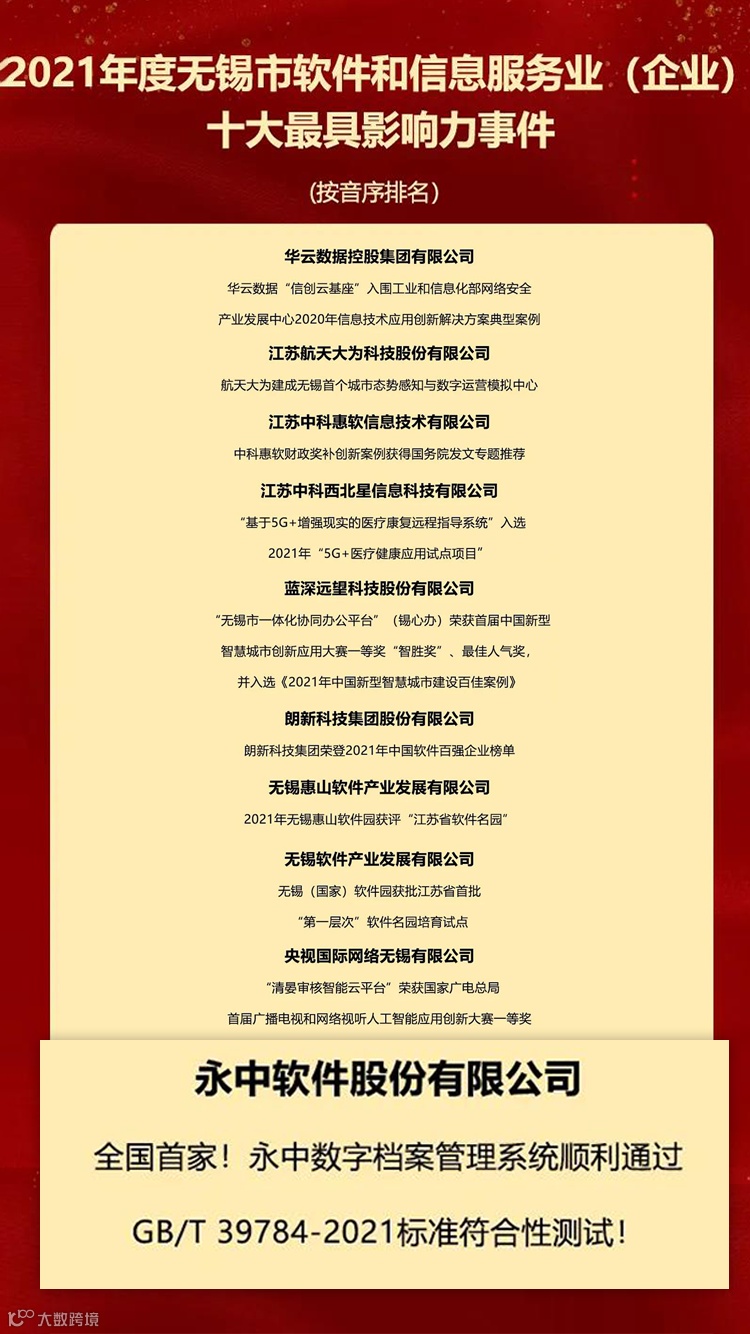 2021年10月29日,永中软件旗下产品永中数字档案管理系统成为首个通过GB/T 39784-2021《电子档案管理系统通用功能要求》(简称《要求》)标准符合性测试的产品,此事件被评为“2021年度无锡市软件和信息服务业(企业)十大最具影响力事件”,这意味着此事件对无锡市软件和信息服务业的发展,发挥出了创新和示范引领作用,具有重要影响力。