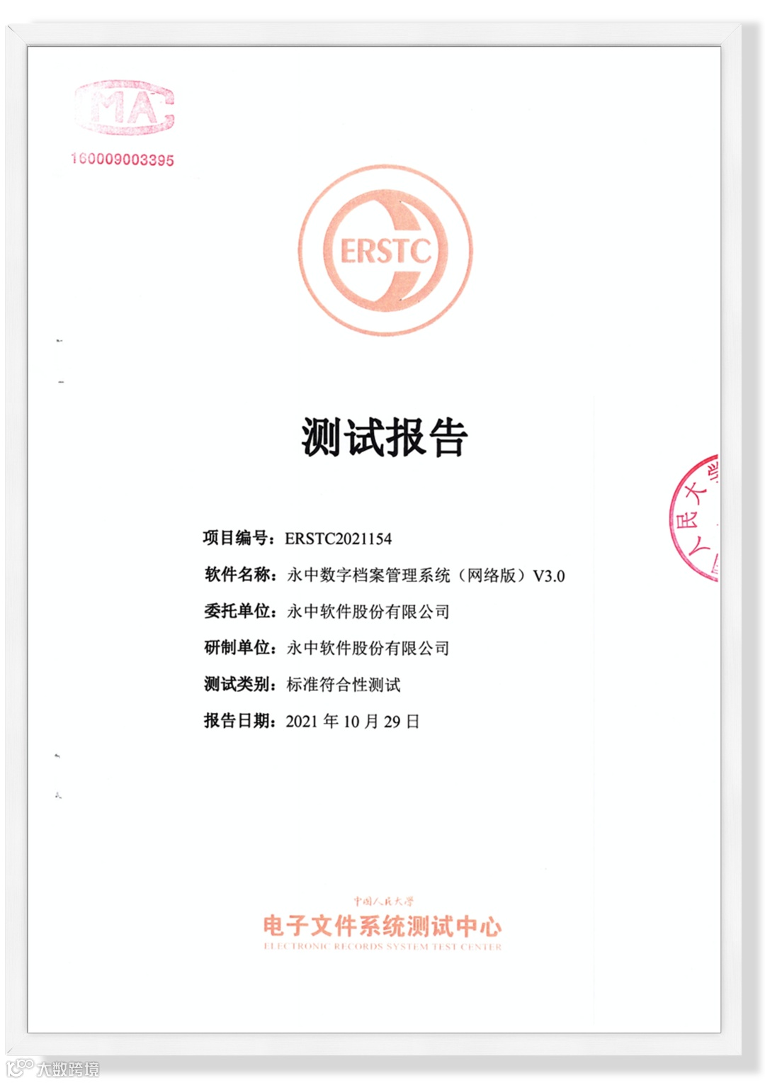 在《要求》发布以后,永中软件第一时间申请了永中数字档案管理系统的标准符合性测试。经过测评和专家评审,永中数字档案管理系统完全符合《要求》关于电子档案管理系统功能的总体要求,以及电子档案的接收、整理、保存、利用、鉴定、统计、审计跟踪和系统管理等关键业务环节和系统管理的通用性功能要求。