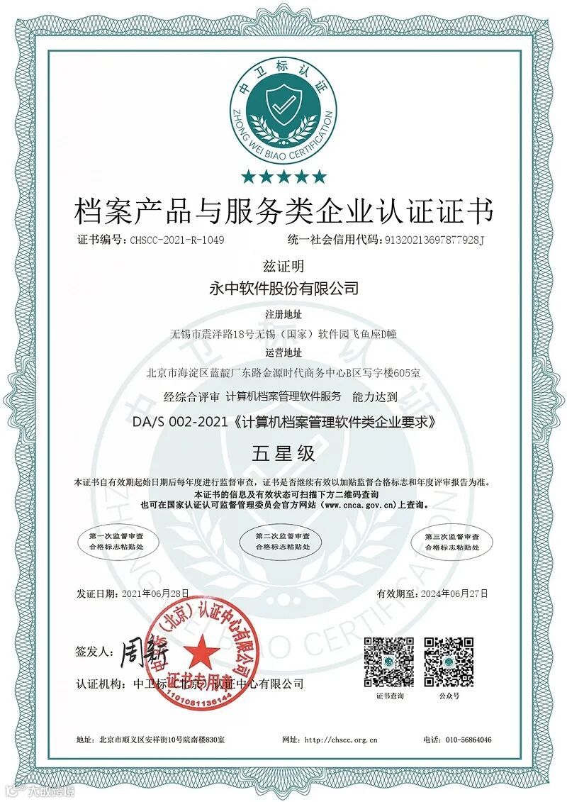 就在近期,永中软件还凭借永中数字档案管理系统获得了“档案产品与服务类企业认证证书“,经综合评审,永中软件计算机档案管理软件服务能力达到了DA/S 002-2021《计算机档案管理软件类企业要求》五星级;永中软件旗下公安数字档案综合管理平台解决方案,被评为2021年江苏省信息技术应用创新优秀解决方案,该方案基于公安档案实际需求,构建档案资源库,有效提升公安系统信息化水平。