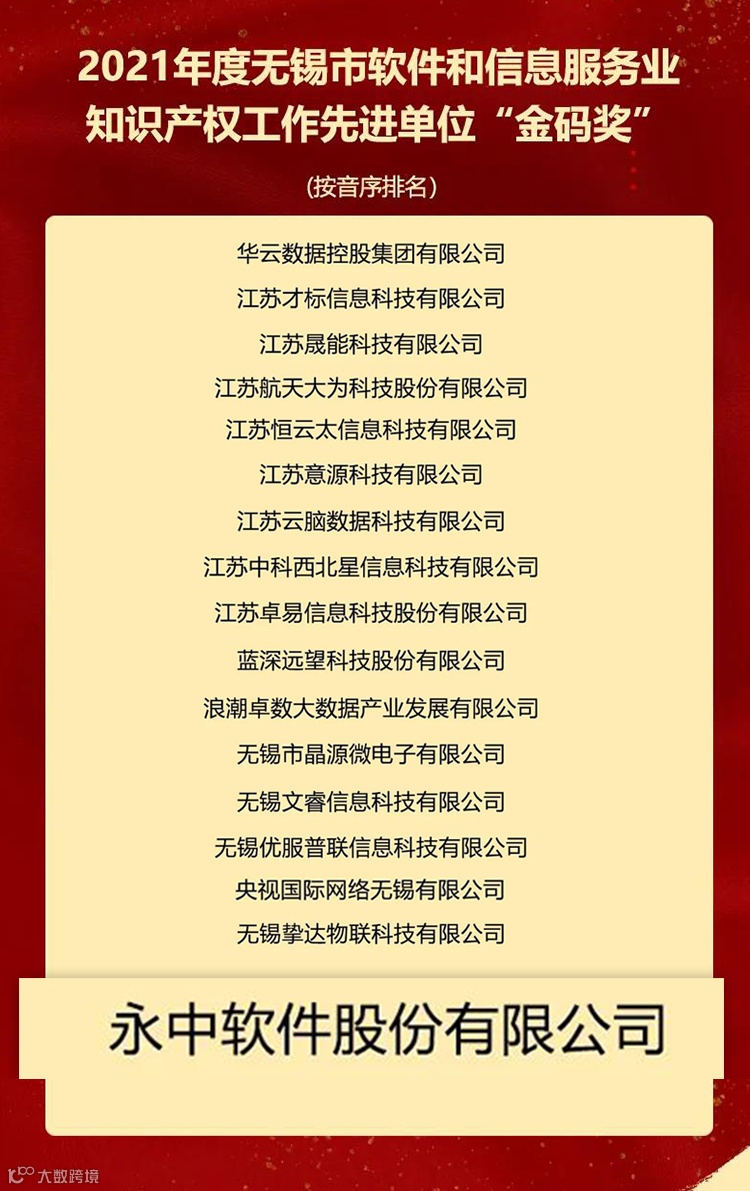 通过单位申报、协会初审、专家评审,永中软件共获得2021年度无锡市软件和信息服务业(企业)十大最具影响力事件、2021年度无锡市软件和信息服务业知识产权工作先进单位“金码奖”两项荣誉。