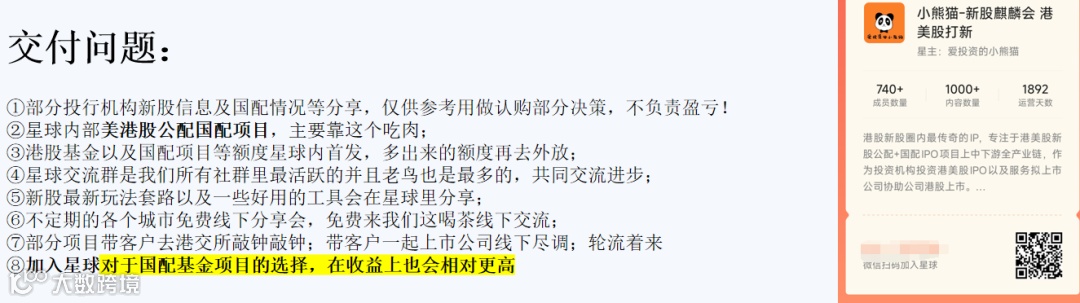我们新活动免费进星球的:有通过我们渠道排排网代销的私募产品的小伙伴,我们都会附送免费加入或免费延长续期一年知识星球权益服务以及星球群服务,和我们经常参与新股项目小伙伴们一起讨论港股新股。