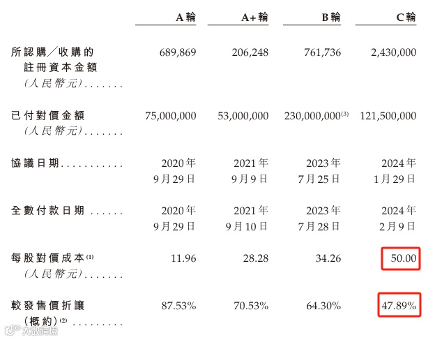 最后一轮融资每股成本为人民币50.00元(相当于53.17港元),较发售价范围内的中位数103.37港元折让47.89%。