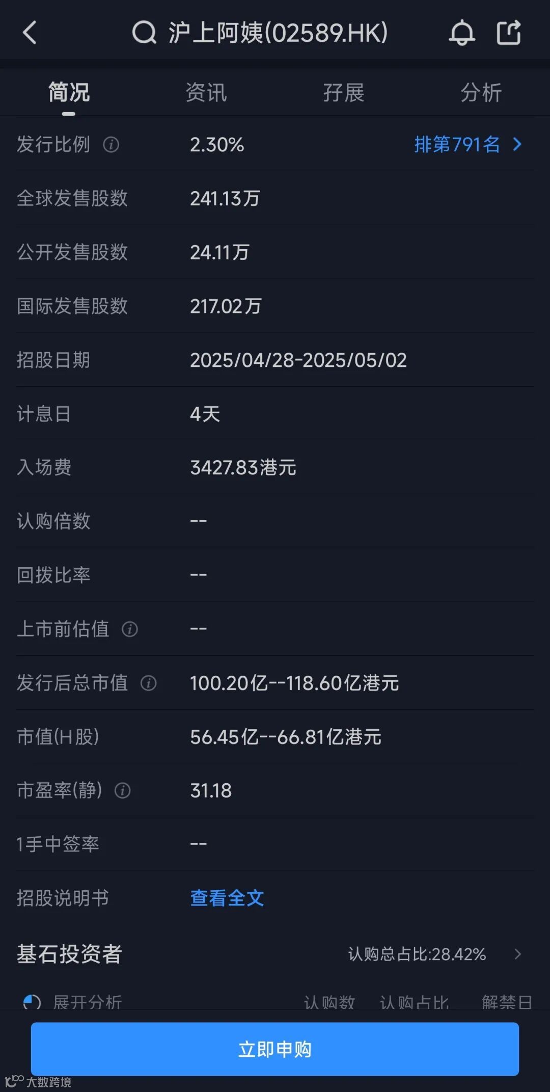 沪上阿姨 这个票的募资只有2.3-2.7亿,发行比例仅仅2.3%应该是所有奶茶股里面最小的,这几乎就是一个新股小票的募资规模,这几乎当做一个小票在炒了,可以当做一个庄股了,以目前的热度回拨50%,国配公配各自1.3亿,假设最后有500倍,公配一倍也才2700万,2700w*500=1350000w,也才135亿,1.3亿/135亿/2=0.00963/2=0.004815,一个乙头2-3w多块钱,不过确实现在很奇怪的是辉立为啥就5000万孖展,富途孖展是很多,不确定是散户还是机构,但是看到富途发的新股认购券这是在怂恿散户去参与 ,这个富途这么高的孖展数据有点失真的,背后真的是机构还是散户就分不清楚了。