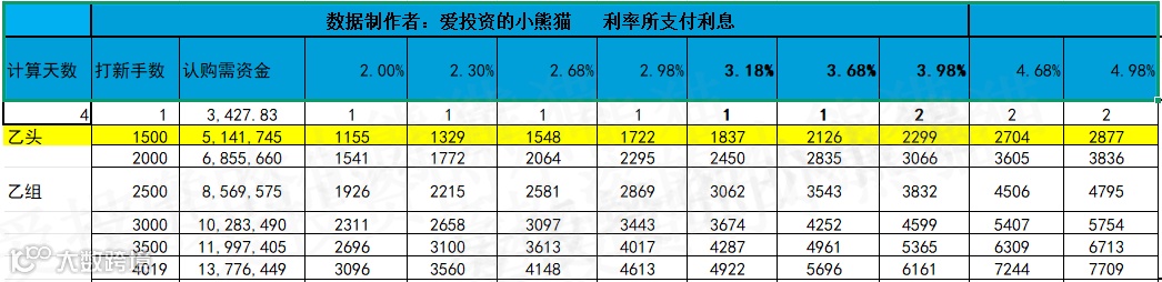 乙头需认购资金515万,乙组各档融资所需要本金还有融资金额对应如下表: