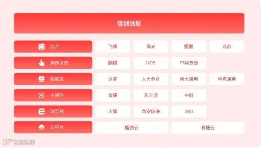 全面适配从硬件服务器到操作系统、中间件等的全栈信创环境,已完成60余种主流软硬件厂商产品国产化适配互认及兼容性证明。