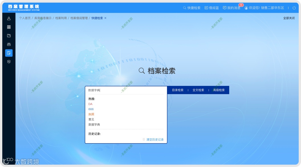 为了提高使用者的工作效率,系统提供多种类型的检索方式,包括:不设定检索字段的简单检索,选定多项检索字段及其逻辑关系的高级检索,模糊检索和精确检索,跨档案门类检索,全文检索等多种不同形式。