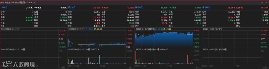 南山铝业国际(02610.HK)辉立暗盘以26.60港元平开,立马上冲最高点27.00港元,又回落到最低点26.60港元后企稳,在26.65港元附近震荡横盘,尾盘以26.65港元报收,涨幅0.19%,振幅1.50%。