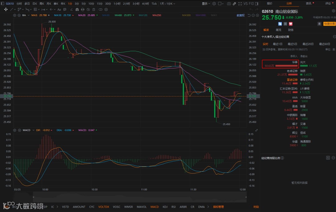 南山铝业国际(02610.HK)今日上市平开,秒升到26.90港元后,立马回落到26.00港元止跌,再震荡上行,在开盘价位置遇阻再次回落,截止中午收盘价为25.75港元,跌幅3.20%。