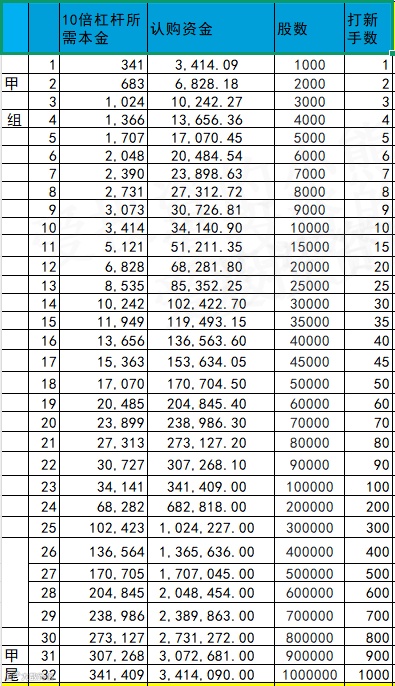 甲组的各档融资所需要的本金还有融资金额对应如下表: