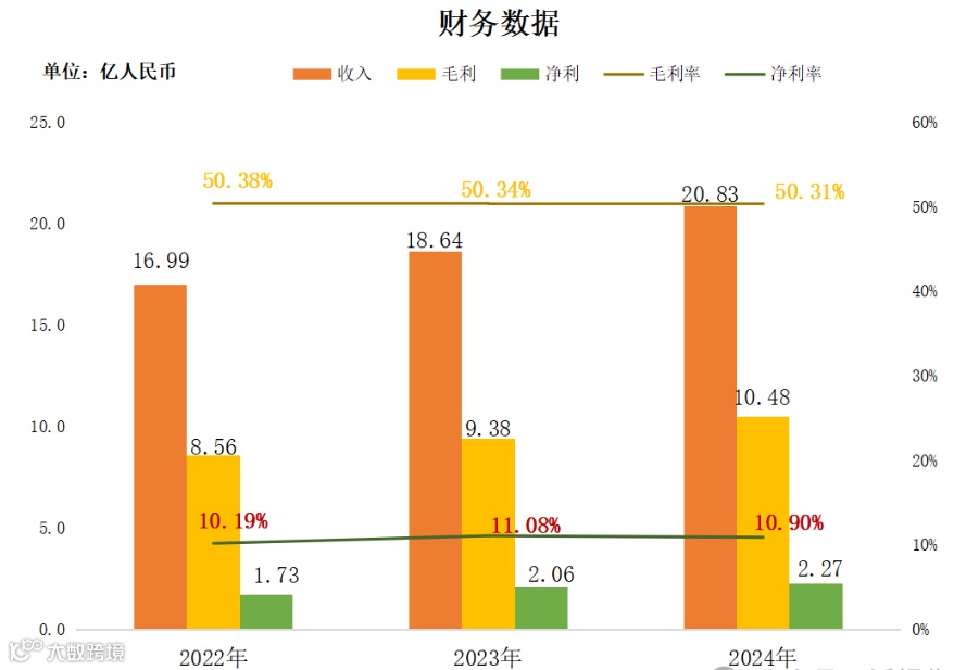 颖通控股收入分别约为人民币16.99亿元、18.64亿元、20.83亿元,年复合增长率为10.73%;