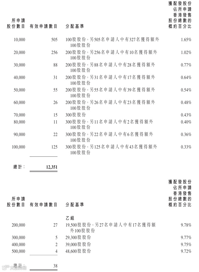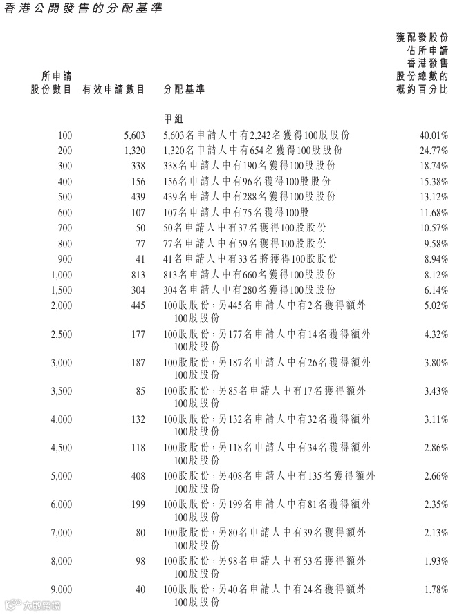 汇舸环保(02613.HK)的乙组官方披露的中签名单里有10人中签19500股,有17人中签19600股,有5人中签29300股,有2人中签39000股,有4人顶头槌认购中签48600股,乙组总共中签94.98万股,货值约3020万港元。
