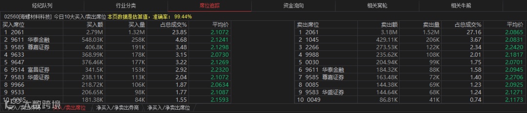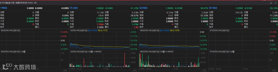海螺材料科技(02560.HK)辉立暗盘以最高点2.88港元低开,快速下跌到最低点2.02港元后,再震荡上行,尾盘以2.06港元报收,跌幅31.33%,振幅28.67%。