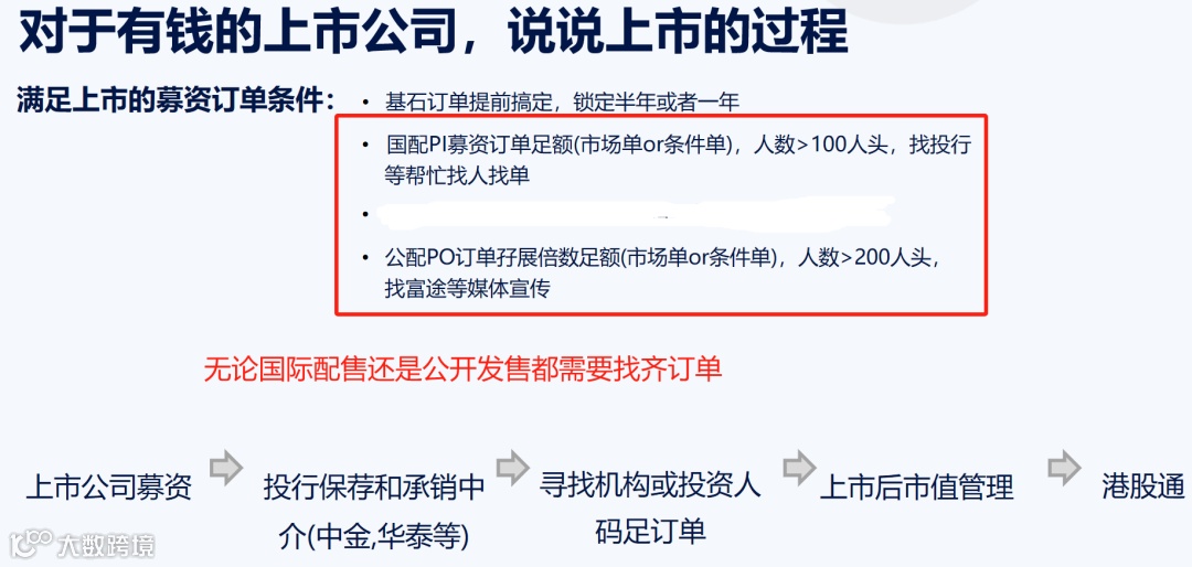 最惨的情况是国配不足。公配也不足额,这里公配至少要超过一倍,如果连一倍都没有,那就叫不足额,如果国配公配两边都不足额,那对这次新股来说,就是募资募不到钱,就是要上市失败了。所以说找齐订单很重要,国配公配两边都找不齐,那就意味着会上市失败,一般公司不太愿意出现这种情况,相当于为了上市白白努力一年甚至更久,钱也花出去了,所有的工作和努力都付之东流,所以无论如何都不能让上市失败!