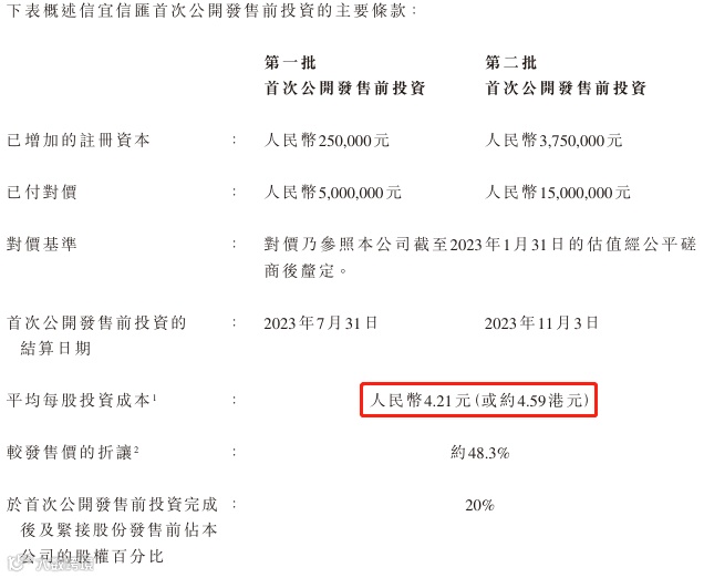 于2023 年7月至11月信宜信汇分两次投资人民币2000万,平均每股投资成本4.59港元。