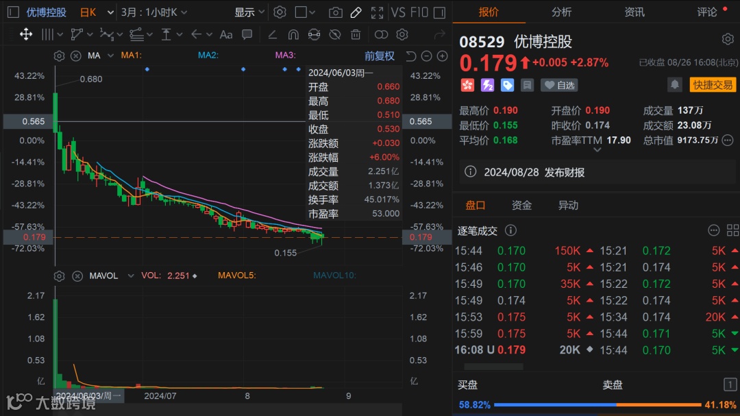 今年上市的另一个优博控股累积跌幅就更加恐怖了,累计到现在都已经跌了60%了。上市首日也是高开低走,不过好歹首日红盘收盘的。