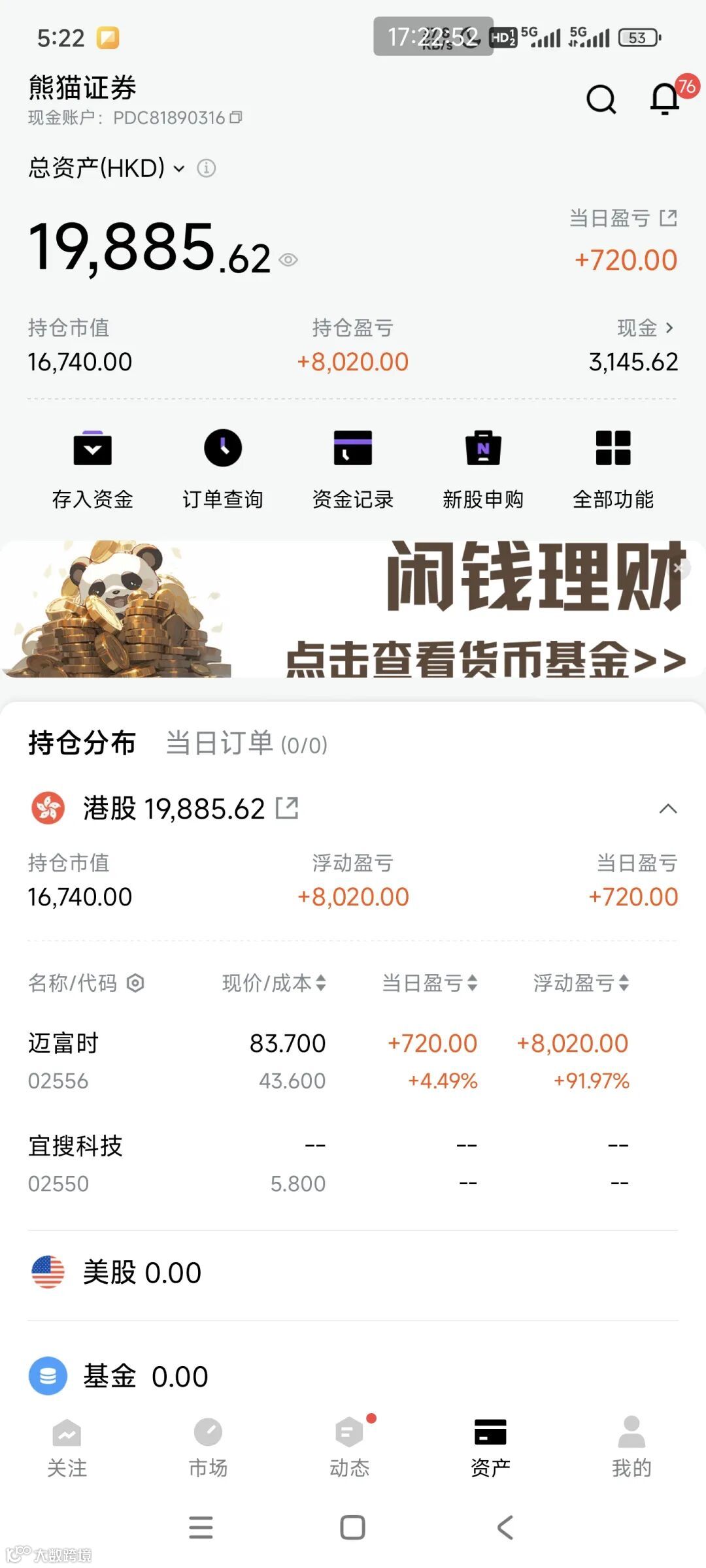 那有些人会问公配要不要打?熊猫券商那边0本金白嫖套餐最高可以认购4万孖展。至少目前公开招股的部分我们自己也就用能白嫖券商账户小摸几手玩玩,反正不占用自己本金,券商借来的钱多好!每个票我们都会事先白嫖玩玩的,需要感受市场的水温,后面几天再去根据实际情况决定是否撤单,所以目前会用熊猫来几个户白嫖认购,不去占用本金,本金拿来做项目!目前我们几百的资金是拿来做美股港股的稳健项目拿收益,这部分吃肉吃得很香,这个去年跟着我们玩的朋友都已经拿到了巨大的结果,炒股还真的不如跟着我们玩这个,光是用收益的部分就可以去当做小资金就去玩玩公配的打新了。