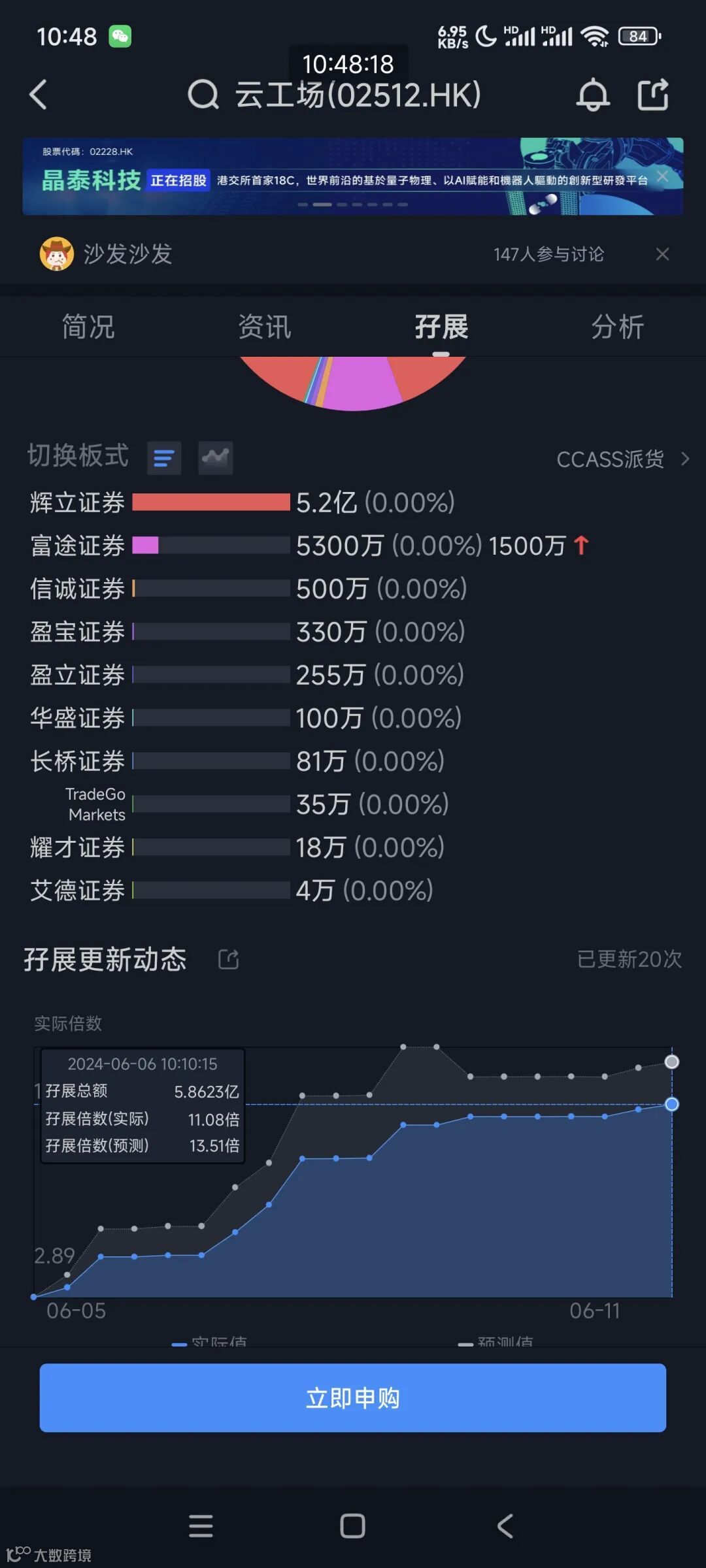 目前展现出来的孖展已超购11倍,妥妥的回拨了