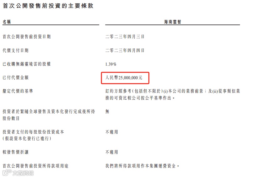 2023年之前,云工场并未获得过任何外部机构投资,仅在2023年4月3日获得来自海南云智的2500万元融资。据招股书,海南云智的执行事务合伙人和普通合伙人为成都工投汇富私募基金管理有限公司,并分别由杨安及成都先进制造产业投资有限公司最终控制及拥有55.0%及45.0%股权。此轮投资完成后,海南云智将持有无锡灵境云总股权的1.39%