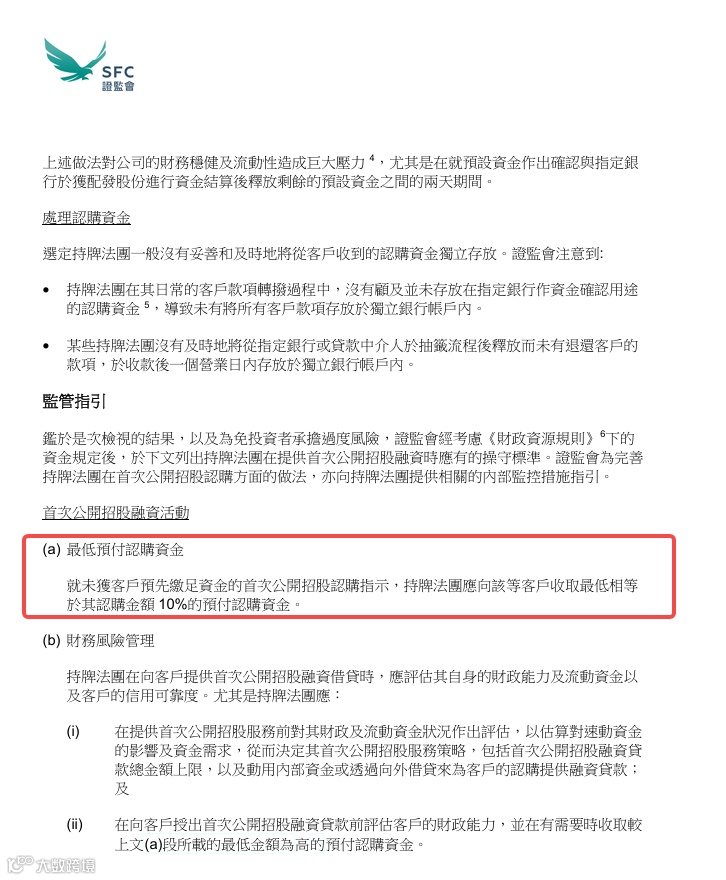 香港证监会在3月20日就首次公开招股认购及融资服务发布通函,要求持牌法团加强风险管理,特别是针对不谨慎和过分进取的融资手法。这可能是因为之前的检视发现了一些问题,比如券商过度关注认购水平而忽视客户财务状况,导致客户过度杠杆和券商违约风险增加。
