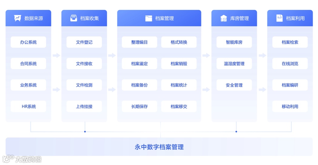 基于党务政务的档案管理系统解决方案以计算机和通信技术为核心,对档案进行数字化管理,使档案信息资源从档案库房中“走”出来,为党政行业用户提供便捷、快速的电子文档管理、文档安全控制、协同办公、多媒体/纸质/PDF多格式处理以及实时全息查档服务,实现档案管理数字化、信息采集标准化、信息存储安全化、档案服务网络化。