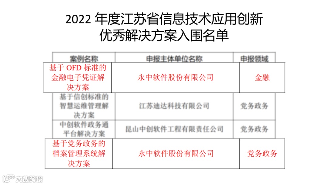 永中软件根植于江苏省二十余年,坚持产品自主创新,是办公软件国产化、数字化、智能化的主要推动者之一,三项解决方案曾入围江苏省信息技术2021年江苏省信息技术应用创新优秀解决方案名单,本次入围的“基于党务政务的档案管理系统解决方案”和“基于OFD标准的金融电子凭证解决方案”两项解决方案,立足金融和党政领域发展需求,为政企数字化转型提供强劲动能,赋能信创产业生态建设。