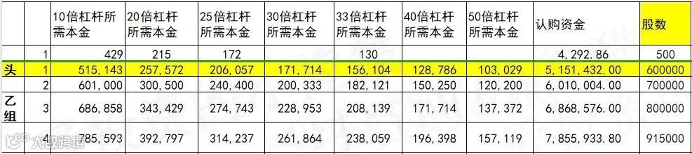 乙组头,这次是516万本金,乙组的各档融资所需要的本金还有融资金额对应如下表:
