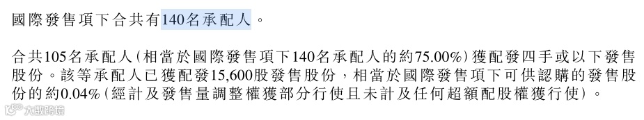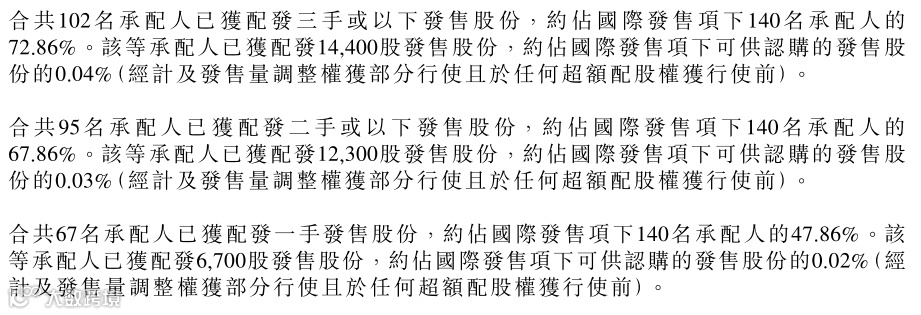 途虎-W国际配售总共140人,其中67人获配1手,28人获配2手,7人获配3手,3人获配4手,仅仅是35人获配五手或以上。