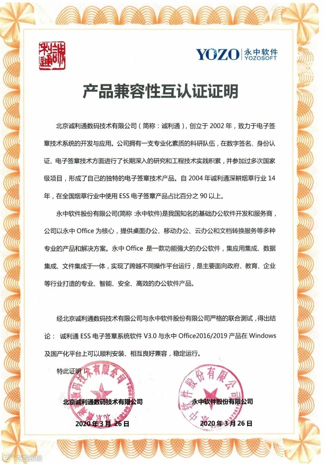 诚利通ESS电子签章系统自上市以来,深受用户欢迎,通过该批量电子签章系统解决了用户票据、文档以及表单的大批量签发的问题,减轻了用户签名盖章的劳动强度,提高了工作效率,已在多行业广泛应用。日前,永中软件与北京诚利通数码技术有限公司完成了联合测试,永中Office 2016/2019与诚利通ESS电子签章系统软件V3.0在Windows及国产化平台上完美兼容,相互适配,使用稳定快速,可以完全满足用户的日常办公需求。