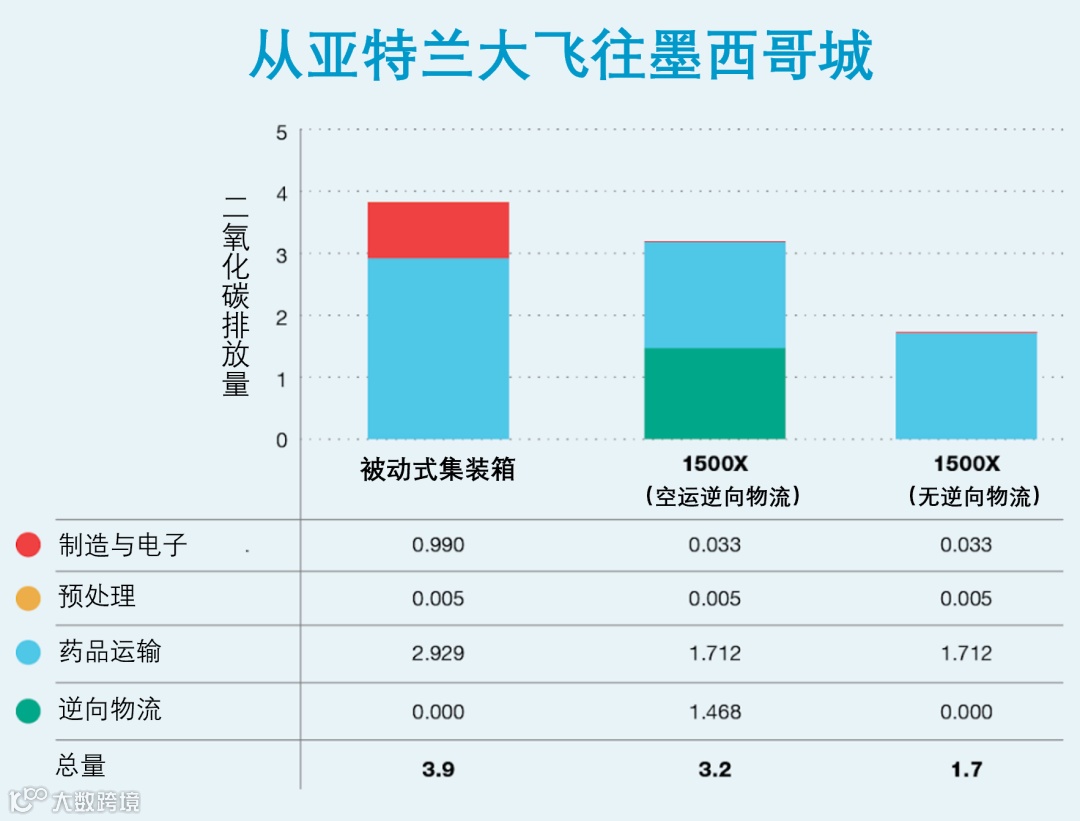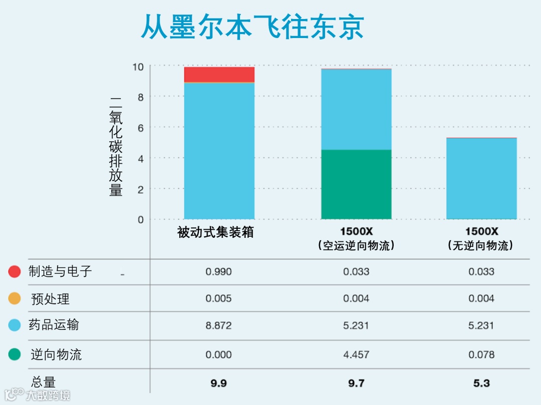 在1500X 进行空运逆向物流的场景下,仍然比被动式集装箱保持了2%的排放优势。该示例展示了1500X 混合式集装箱的出色节能性能,能够将运输距离延长两倍,同时减少排放、资源使用和浪费。