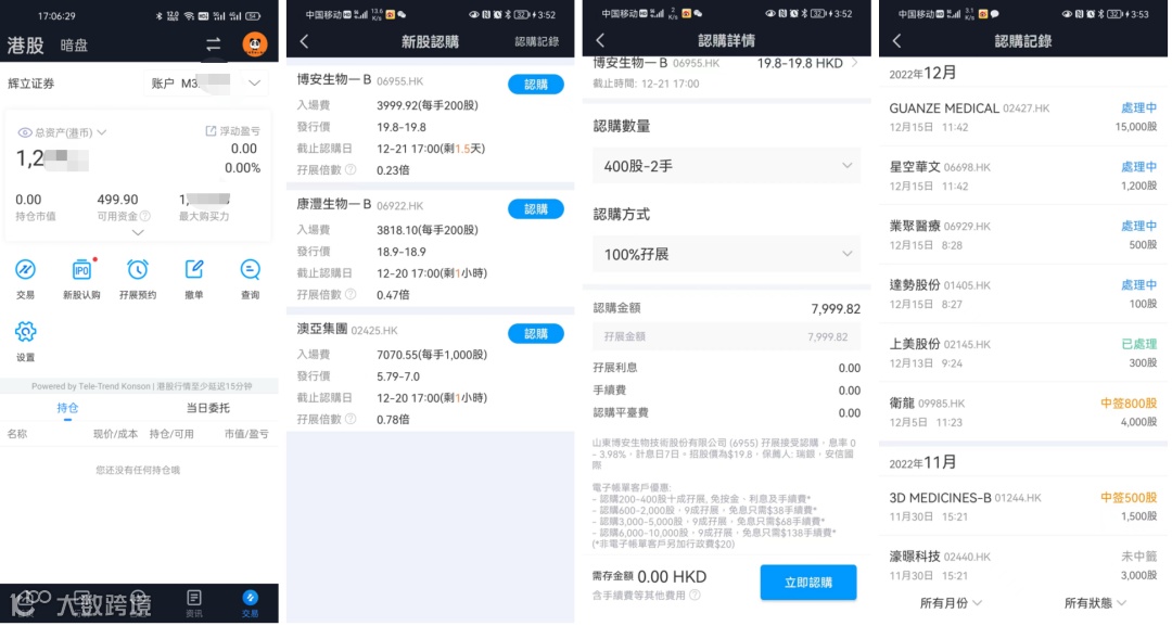 交易宝的app上辉立账户新股认购的界面如下图所示:同样都有100%孖展,0元,38套餐,68套餐这些都有的,还能显示历史认购记录,相信这个界面很多朋友应该就比较熟悉了。